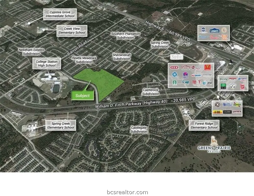 Designated "urban" in city's comprehensive plan for intense land use such as general commercial activities, office, townhomes, apartments, and vertical mixed-use. At the epicenter of growth near College Station High School. 1/2 mile of frontage along Victoria Avenue. All public utilities in the immediate area reducing cost of off-site improvements. New traffic and pedestrian signals at the intersection of William D. Fitch & Victoria Ave.