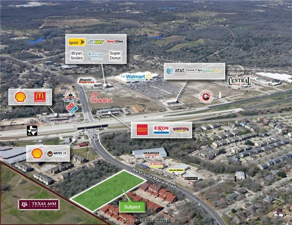 - Excellent access & visibility via West Villa Maria Road - Positioned between Texas A&M University and Traditions Golf Club and Community - Key intersection in expanding West Bryan - Located near the intersection of West Villa Maria Road and FM 2818 - Close proximity to Rudder’s Landing, a new Walmart anchored shopping center in West Bryan