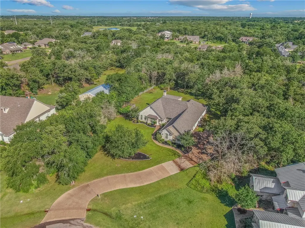 Enjoy the peaceful ambiance of country life with the conveniences of the city. This sprawling two acre estate offers a functionally designed one and half story floor plan with all four bedrooms on the main level, and bonus room and full bath upstairs. This home was designed to fit the lifestyle of everyone, and is located just 10 minutes from Kyle Field! The stately elevation greets you with a grand foyer that leads to a formal dining room, perfect for entertaining family and friends. The open-concept kitchen is a chef's delight, featuring a breakfast bar, breakfast nook, granite countertops, an island, and top-of-the-line stainless steel appliances including a gas stove and double oven. Dual pane windows and southern exposure fill the home with natural light. The main floor primary bedroom is a true retreat, with direct access to the oversized covered back patio. Additionally, the suite offers a luxurious master bath with dual vanities, soaking tub, and walk in shower. Tucked away upstairs is a flex game room with a full bath, one large storage closet, two game closets, a wet bar, and two attic access areas for additional storage. Step outside to your private oasis with a beautifully landscaped back yard, large covered patio with multiple fans, and private garden. This pie shaped lot is just over two acres and perfectly blends functional space for play sets and outdoor living with the seclusion of heavily wooded back acreage.