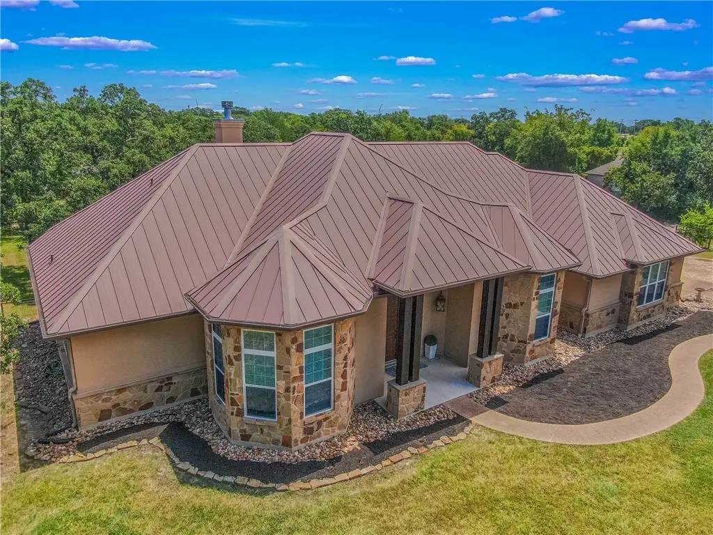 Tucked away on 3.45 acres of peaceful countryside, this rustic retreat offers the charm of country living with the convenience of being just minutes from Jones Crossing’s shops, dining, and H-E-B and only 8 minutes to Texas A&M. As you step through the front door, you're welcomed by rich custom cabinetry, crown molding, and recessed lighting that flow throughout the home, setting a warm and refined tone. The living room invites you in with large windows that fill the space with natural light, custom built-ins, and a cozy fireplace. The formal dining room and private office are framed by elegant bay windows ideal for gatherings or quiet productivity. The kitchen is designed for ease and function, featuring a double oven, dishwasher, and an prep sink built into the island. Each bedroom offers unique touches: one with double closets, another with a built-in writing desk or make-up vanity and a generous walk-in closet, connected by a Jack-and-Jill bath. The serene primary suite includes tray ceilings, two oversized walk-in closets, dual vanities, a soaking tub, and a walk-in shower with dual shower heads. Step outside to enjoy a spacious back patio overlooking the open acreage, ideal for entertaining. The property also includes a large outdoor workshop for equipment and storage, a convenient half bath with patio access, and an oversized laundry room with utility sink. This home blends rustic elegance with thoughtful design—country comfort close to it all.