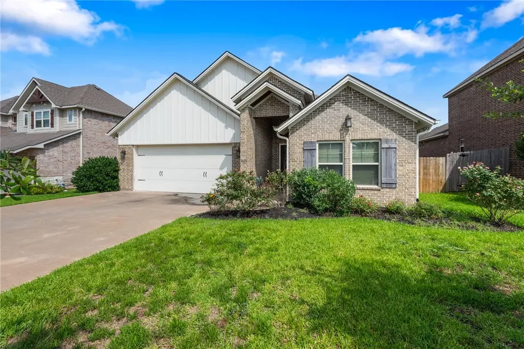 Welcome to this stunning modern home with farmhouse flair, nestled in the highly desirable Castlegate II community. Step inside to find soaring ceilings and a grand entrance that sets the tone for the open and spacious layout. The solid wood front door with glass insert leads into the main living area featuring beautiful wood floors, custom cabinetry, and a cozy gas fireplace framed by built-in shelving and a tasteful mantel. The thoughtfully designed kitchen boasts ample counter space, a gas range, built-in oven and microwave, and an open layout perfect for entertaining. A custom desk area, mudroom drop zone, and energy-efficient features like foam insulation, a tankless water heater, and zoned thermostats add both style and functionality. The home includes a vaulted ceiling in the front bedroom and tile surrounds in all showers. The luxurious primary suite offers a large bedroom, dual vanities with decorative mirrors, a standalone soaking tub, a walk-in tile shower, and a spacious walk-in closet with built-ins. Upstairs, you’ll find a versatile bonus room, a full bathroom, and an additional bedroom—ideal for guests or a home office. Enjoy the oversized covered back patio complete with a built-in gas grill and great privacy. The neighborhood features sidewalks, a community pool, and is conveniently located near schools, shopping, Highway 6, and Texas A&M University.