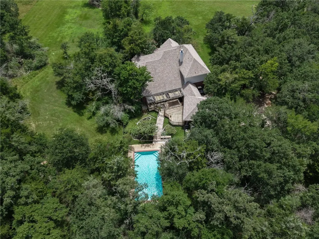 Freshly painted inside and out his single owner custom home sits on a very private, heavily wooded 2.66 acre lot in River Run Estates just minutes to College Station amenities. The flexible floor plan offers 4 bedrooms, 2 full baths, 2 half baths, 2 living areas & 2 dining areas. The sun-lit entry leads into the open concept family and formal dining rooms with soaring ceilings and a wall of windows that overlook the covered patio and in-ground pool. The well-appointed kitchen & breakfast area are located off of the family room and offer solid surface counters, extensive built-ins and a large pantry. The private owner's retreat is downstairs at the back of the house and features large windows overlooking the pool. The primary bathroom includes a frameless glass shower enclosure and separate jet tub. Completing the first floor is a laundry room with a sink and ample storage along with a convenient half bath for both indoor and outdoor pool guests. Beautiful wood floors are throughout the downstairs living area and primary bedroom. The second level provides 3 spacious bedrooms with large closets and a full bathroom. The upstairs game room serves as a large second living room and offers extensive built-ins and a convenient half bath. Stepping outside, a patio flows onto an extended large deck that leads to the large in-ground pool. The outdoor entertaining areas are surrounded by landscaped beds and large mature trees offering a tranquil private setting just minutes to amenites!