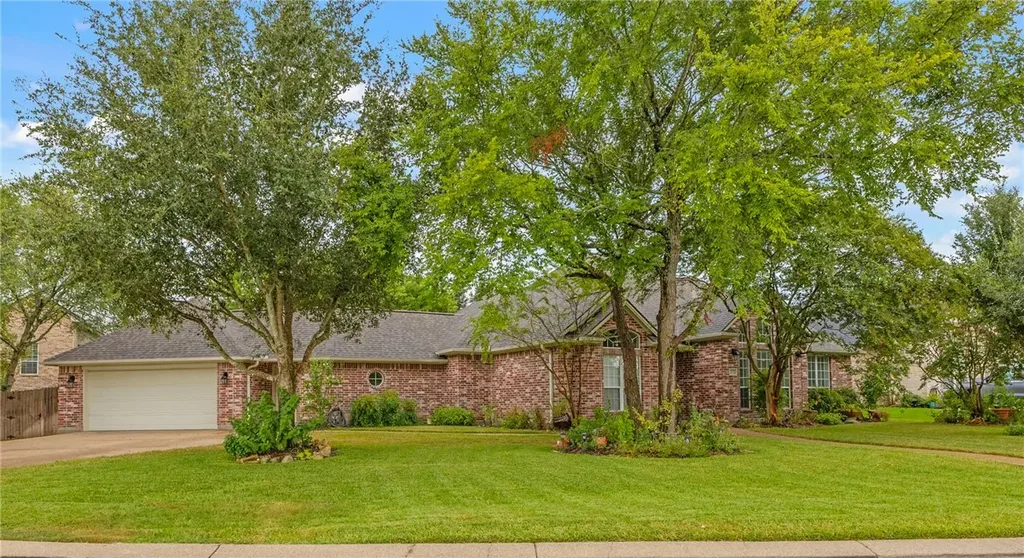 Welcome to comfortable living in the desirable Castlegate neighborhood in growing South College Station—known for top-rated schools, scenic walking trails, a neighborhood parks, tennis courts and a serene community ponds! This well-maintained 3-bedroom, 2.5-bathroom home with a versatile office/study offers spacious living in a well-established area that blends charm and convenience. The inviting living room is the heart of the home—ideal for relaxing or gathering with guests. Enjoy meals in the formal dining room or casual mornings in the bright breakfast area. The kitchen offers generous cabinet and counter space, stainless steel appliances, an electric cooktop, and dishwasher—ready for everyday use or weekend hosting. The expansive primary suite features a walk-in closet and en-suite bathroom with dual vanities, a jetted tub, and walk-in shower. Two additional bedrooms share a full bath with double sinks, providing space and function for all residents or guests. A dedicated office/study provides flexible space for remote work, study, or hobbies and offers extra coziness with it's double-sided fireplace. Step outside to a shaded backyard with mature trees and raised garden—perfect for relaxing on sunny afternoons. Additional highlights include a 2-car garage, ample storage, and a thoughtful layout designed for daily comfort. Castlegate offers a strong sense of community, top schools, and nearby parks and trails—all just minutes from shopping, dining, and major roadways